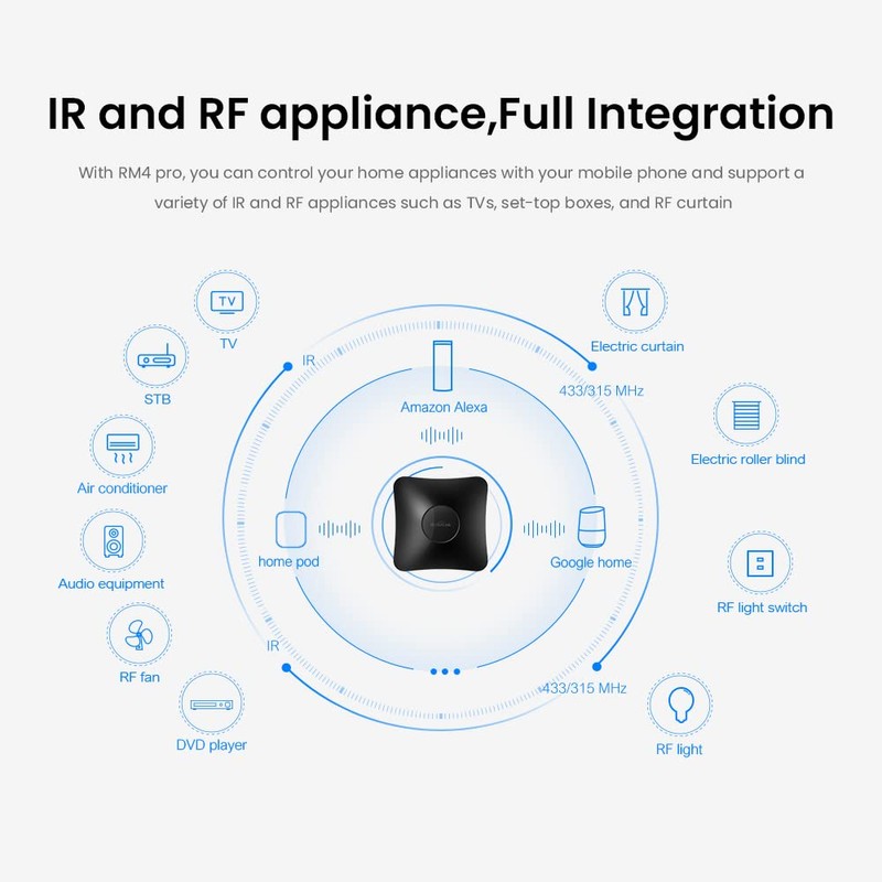 - Support RF (433MHz+315MHz) controlled devices such as curtain/shades motor, projector and light switch; Support 50,000+ IR controlled devices such as TV, STB, Air conditioner, Fan, Video Recorder, DVD and more; Does not work with Bluetooth. Supported devices library is constantly being updated by the cloud, so your RM4 pro is always compatible with newer devices. Option to program your devices and learn buttons if certain cloud data is unavailable.