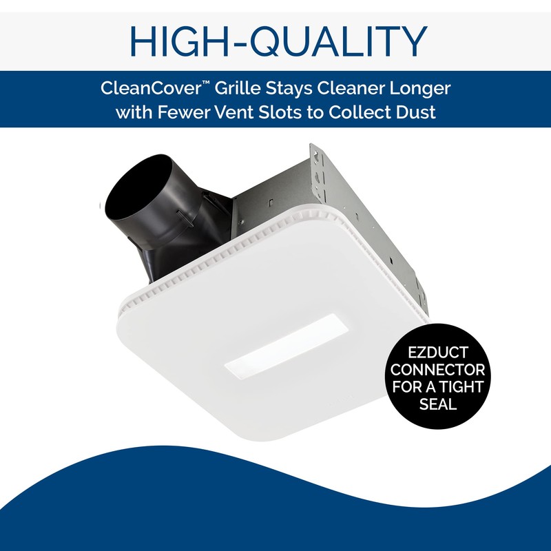 The Broan Flex Series Ventilation fan with LED lighted CleanCover grille clears the air with a low profile, streamline design. This high-quality Energy Star Certified single speed fan eliminates moisture and reduces humidity in your bathroom at 80 CFM up to 75 sq. ft. Say good-bye to unsightly standard grilles that catch dust and debris and can be a hassle to clean. With CleanCover, your fan cover stays cleaner for longer with fewer vent slots to clean and design that coordinates with any decor. Designed for retrofit, remodel and replacement, this fan features hassle-free installation from the room side, for spaces with no attic access. The SnapFit Flange Kit, EzDuct connector and FoldAway mounting ears make it flexible to almost any installation challenge, especially for rooms on the first floor or basement floor of the home. The SnapFit Flange Kit provides a self-trimming finish to cover a rough cut. This item is UL listed for use over bathtubs or showers when connected to GFCI-protected branch circuit (not included). UL listed for use in insulated ceilings (type I.C.) and HVI-2100 certified for safety. Housing dimensions measure 9.25" x 10" x 5.75". This item is backed by a three year limited warranty for your convenience. Broan leads the industry with forward-thinking residential ventilation products, customized climate, communications and home automation solutions along with award winning customer service. Broan’s inspiring heritage provides the foundation for its three global brands – Broan, NuTone and BEST.