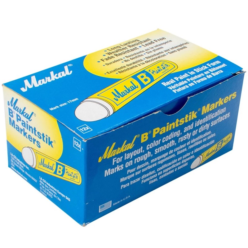 12 Pc Box Black Markal B Paintstiks Crayon Marks Water Oil Dirt Extreme Temp Paint Stick Chalk for Auto Tire Construction Fabric LumberSet of 12 Markal B Paintstiks Designed to write on the most challenging of surfaces including water, dirt, oil and extremely cold/hot temperatures. Creates solid, reliable markings on any imaginable surface such as Wood, Metal, Aluminum, Glass, Rubber, Concrete and Plastic. FEATURES