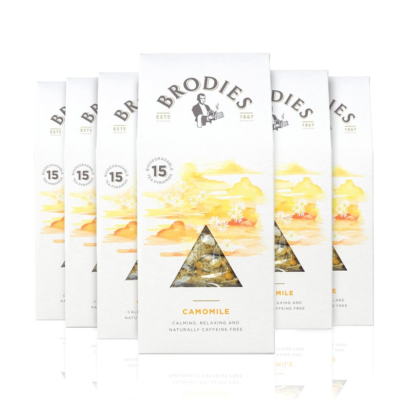 - Contains 6 tea boxes of 15 biodegradable pyramid bags (total 90 bags) of the Camomile line by Brodies, produced with Camomile flowers grown on the plains of Egypt
