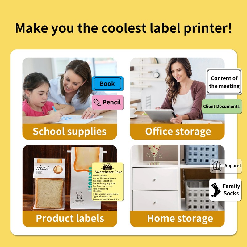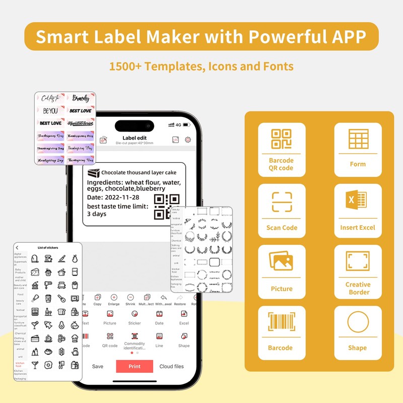 • 【Widely used】There are a lot of templates in APP, provides various graphics,barcodes,QR codes Label,and symbols. you can easily print any label you need. The bluetooth label maker machine which can be used widely in business or household, including jar labels, name labels, price labels, clothing tag labels, jewelry price tag, address labels, labels for home organization, files folder or office equipment, cable labels, decorated holiday gifts and greetings labels, etc.
