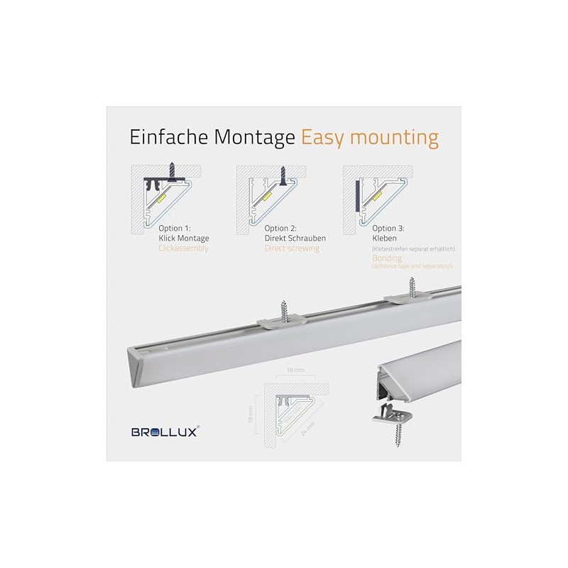 - Easy to install: the LED profile can be cut with a hand saw and can be easily mounted in the retaining clips with a click. The cover can be pushed on or clicked in.
