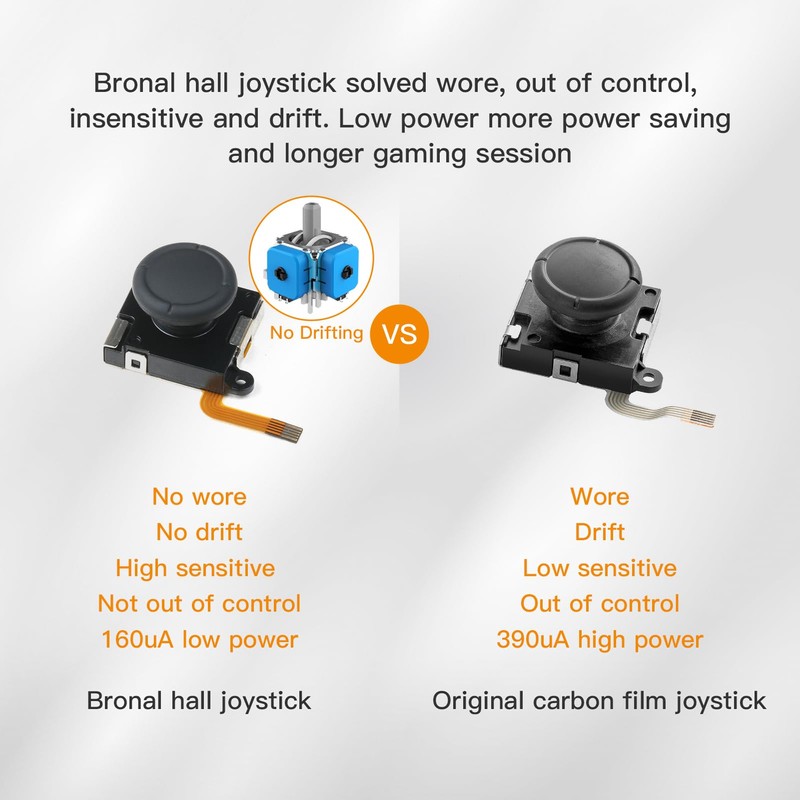 • [Bronal Electromagnetic Hall Effect Joystick] Bronal Hall Sensor Joystick specifically works for the Joycon controller of Nintendo Switch (2017 Release), Nintendo Switch lite (2019 Release) and Ninetndo Switch OLED Model (2021 Release). Bronal Hall joysticks can solve wore, out of control, insensitive and drift.