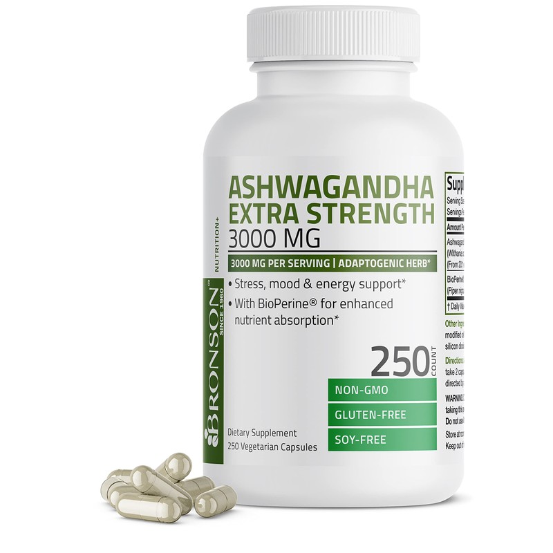 - Herbal Stress Support: Ashwagandha Extra Strength 3000 MG helps to support a healthy stress response, maintain healthy cortisol levels, support a positive mood, and memory.* Bronson’s Ashwagandha additionally includes BioPerine, which has been clinically shown to enhance nutrient absorption.*