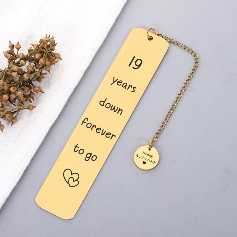 - Copper Anniversary Gifts for Him Her: Celebrating 19 years of unwavering commitment? Honor this special milestone with a timeless metal bookmark - crafted to endure through every chapter of your lifelong journey together. Engraved with:"19 years down forever to go --Happy Anniversary." 19th wedding anniversary gift for spouse, marriage anniversary gifts idea for husband, hubby, wife, wifey, her, him, girlfriend, boyfriend, couple, lover, new couple, soulmate, or someone you loved.