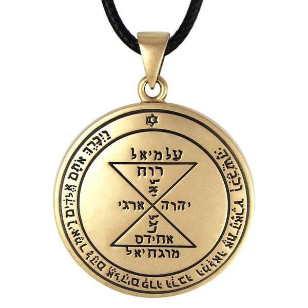 This is a reproduction of a talisman design found in the "Key of Solomon", a grimoire of ceremonial magic attributed to King Solomon. Containing influences of Hermetic alchemy, Roman Astrology and Kabbalah, Solomon's magic is a cornerstone of the Western Esoteric occult tradition. The grimoire explains: "This, if it be only shown unto any person, serveth to attract love. Its Angel Monachiel should be invoked in the day and hour of Venus, at one o’clock or at eight." Samuel Liddell MacGregor Mathers, a ceremonial magician and editor of the most common edition of the book, further describes: "The following Names are written within the Figure:– IHVH, Adonai, Ruach, Achides, Aegalmiel, Monachiel, and Degaliel. The versicle is from Genesis i. 28:– "And the Elohim blessed them, and the Elohim said unto them, Be ye fruitful, and multiply, and replenish the earth, and subdue it."
