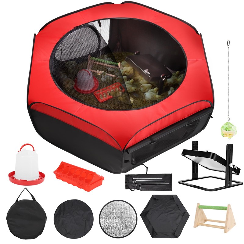 - Complete Starter Kit: Includes a heating plate, pop-up brooder playpen, feeder, waterer, perch, and vegetable hanging feeder, providing everything needed for raising up to 15 chicks, ducks, or quail.