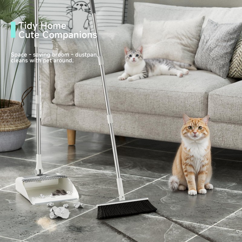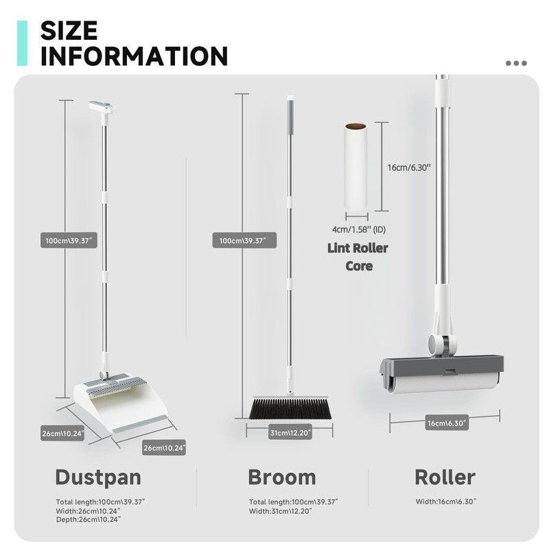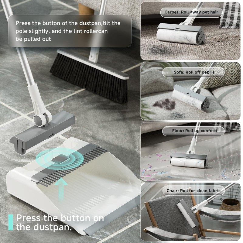 - 3-in-1 Versatile Design: This broom and dustpan set features an integrated lint roller right on the broom head. Not only does it effortlessly sweep up dust, pet hair, and solid debris, but the built-in lint roller also lets you quickly tackle crumbs, lint, and pet hair from rugs—or even clean up party confetti in a snap!