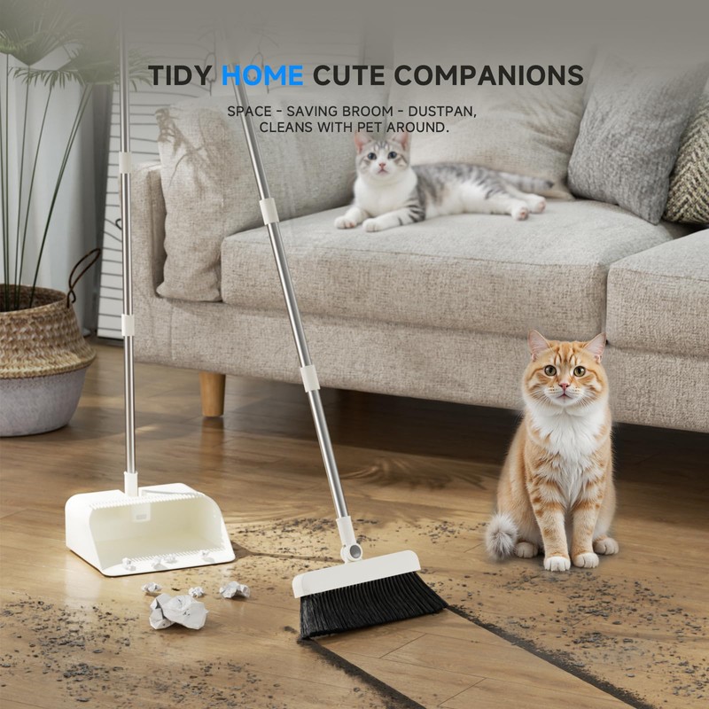 - Edge-to-Edge Hair & Debris Removal: The angled silicone broom head with dense 25mm bristles lifts fine particles, crumbs, and pet hair with ease. The dustpan with teeth ensures hair and dirt are scraped off efficiently—ideal for hardwood and tile floors.