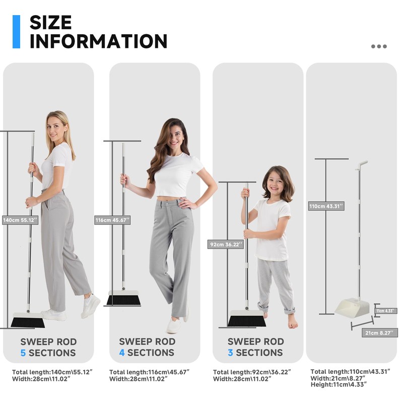 - Adjustable Handle Length for All Users: Customize your cleaning comfort with three detachable stainless steel pole sections. Adjust the broom’s height from 92cm to 140cm to suit kids, adults, or tight areas. Whether you're sweeping upright without bending or using a compact handle with the built-in squeegee, this flexible design adapts to your needs.