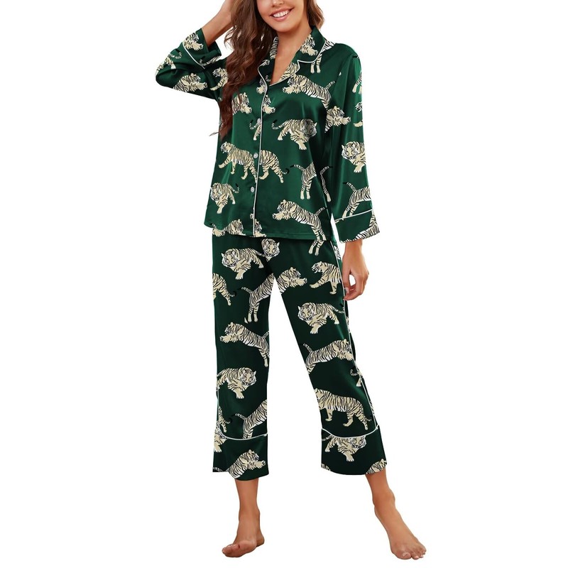 Brosloth Womens Satin Button Up Pajamas Long Sleeve Soft Silk Pajamas Sets Cute Tiger Print 2 Piece Loungewear Dark Green L
