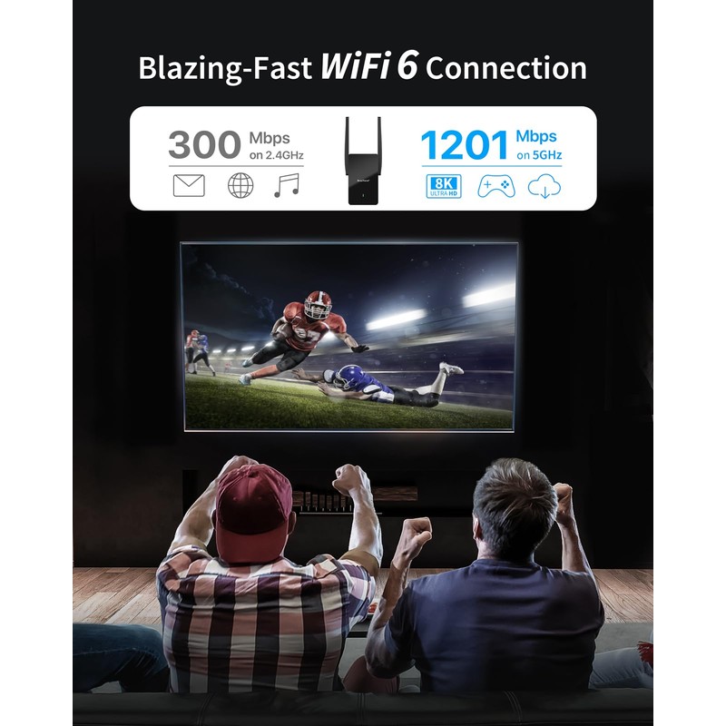 - 1500Mbps WiFi 6 Speeds: Unlocking blazing-fast speeds of 1201Mbps on 5GHz band and 300Mbps on 2.4GHz band, this WiFi extender ensures seamless connections for activities like live streaming, content downloads, and gaming