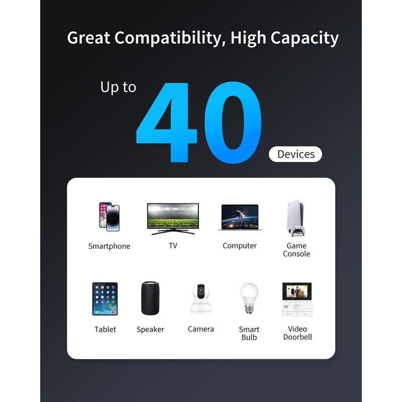 - Great Compatibility, High Capacity: Works with any WiFi devices, such as smartphones, TVs, computers, game consoles, tablets, cameras, speakers, video doorbells, etc. With a higher capacity of 40 devices, this wireless WiFi repeater is perfect for multi-device households