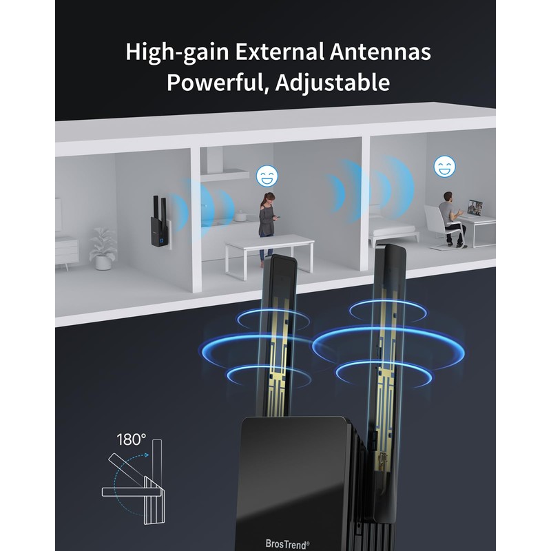 - High-gain Antennas: Equipped with 180-degree rotatable powerful antennas, this WiFi booster and signal amplifier offers maximum WiFi range for your devices. Say goodbye to WiFi dropouts even in areas with thick walls and floors
