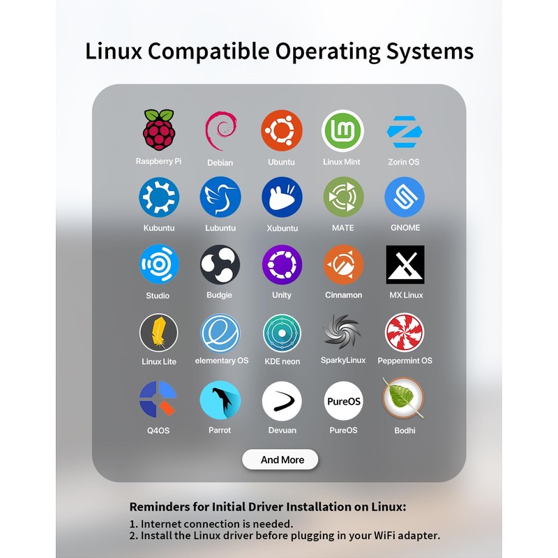 - Linux Compatible Operating Systems: Supports Kernels up to 6.8, Ubuntu 24.04~16.04 (all flavors), Raspberry Pi OS 12~8, Debian 12~8, Linux Mint 21~18, LMDE 6~1, Zorin, MX Linux, Linux Lite, elementary OS and MORE. More supported OSes of this Linux USB WiFi adapter are listed below