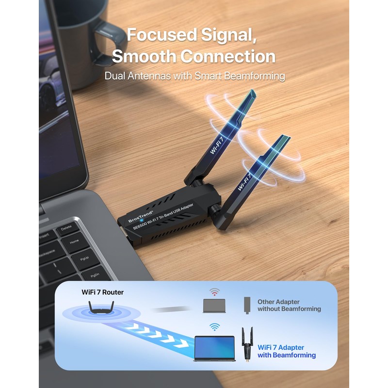 BrosTrend BE6500 Wi-Fi 7 USB WiFi Adapter for PC Desktop Laptop, Long Range WiFi Dongle Tri-Band 6GHz 2882Mbps + 5GHz 2882Mbps + 2.4G 688Mbps, Wi-Fi USB Wireless for Windows 11/10, 4K-QAM WPA3, USB3.0