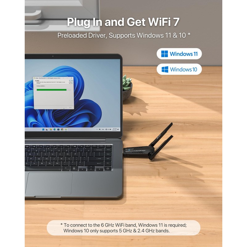 - Plug In and Get WiFi 7: The USB WiFi adapter features a pre-loaded driver for effortless setup—no CD or downloads needed. Compatible with Windows 11/10. Note: To connect to the 6 GHz WiFi band, Windows 11 is required; Windows 10 only supports the 5 GHz and 2.4 GHz bands