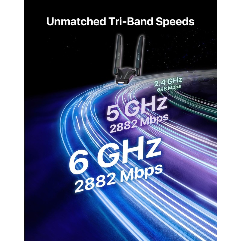 - Unmatched Tri-Band Speeds: Experience blazing wireless speeds up to 6.5 Gbps—2882 Mbps on 6 GHz, 2882 Mbps on 5 GHz, and 688 Mbps on 2.4 GHz. Enjoy exceptional throughput and low latency for all your high-demand tasks with the USB WiFi dongle