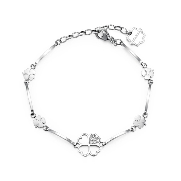 - Semi-rigid 316L stainless steel bracelet with four leaf clover and clear crystals.