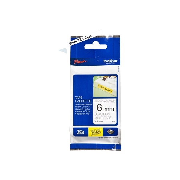 BROTHER TZES211 Spezialband 6mm 8m weiss schwarz extra-stark-klebend fuer Beschriftungsgeraet
