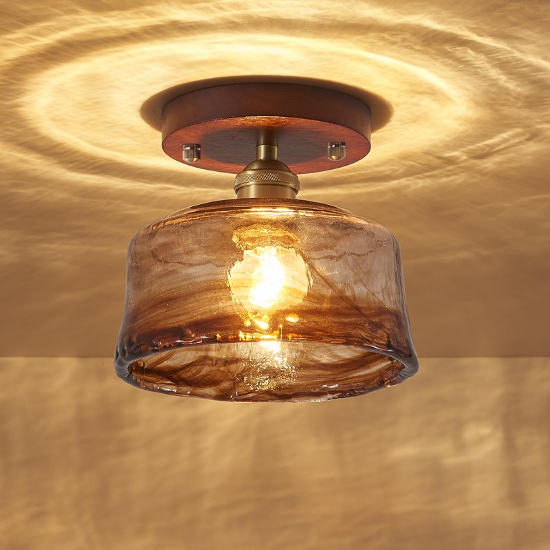 Semi Flush Mount Ceiling Light, Mid-Century Modern Ceiling Light Fixture, Brown Glass Lampshade Vintage Hallway Lights Fixtures, Wood Base Flush Mount Ceilings Lights for Bedroom 【No Bulb Included】