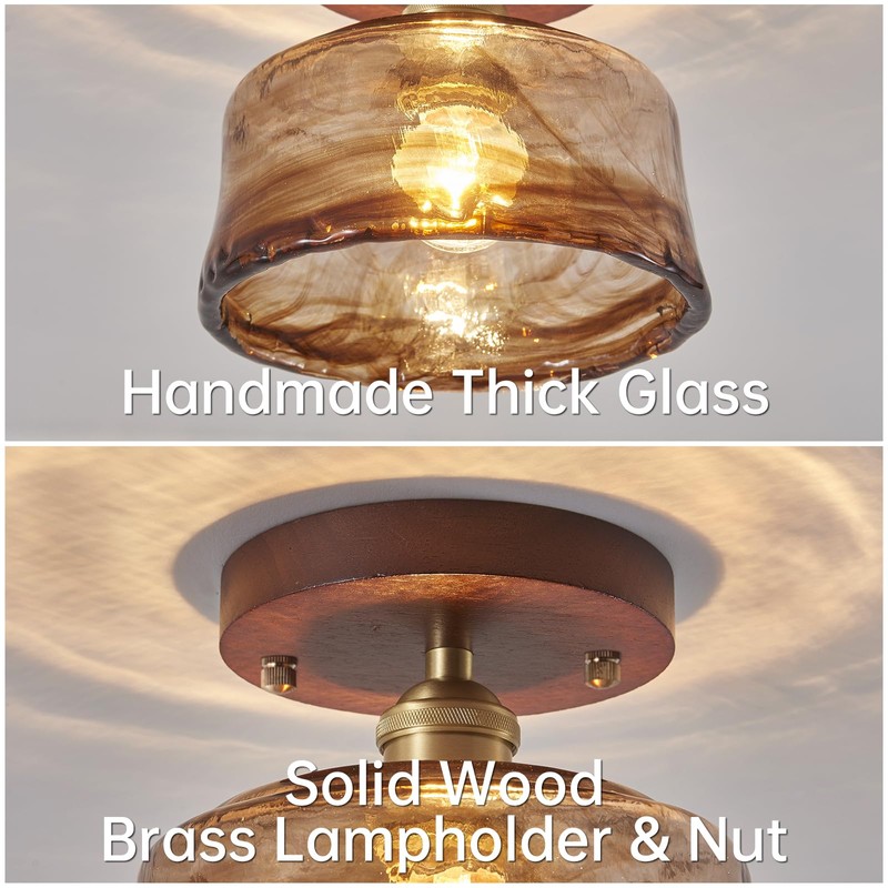- 【Natural Wood, Pure Brass & Premium Brown Thick Glass】 - Base crafted from natural rubberwood, polished & cut for premium finish; pure brass connectors & holder ensure durability. Thick explosion-proof glass lampshade in brown tea hue, fired to perfection. Designed for semi flush mount ceiling light, blending luxury with stunning illumination.