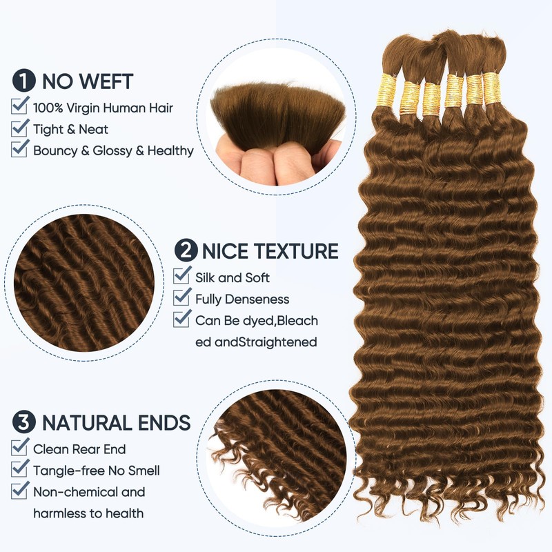- LONG DURATION:Our brown deep water Wave Human Hair bulk are the best extensions for weaving, no wefts will not damage your scalp. No professional skills are required to complete complex weave styles. Weaves can be straightened, curled or dyed like your own hair. Micro weaves can last for months with good care