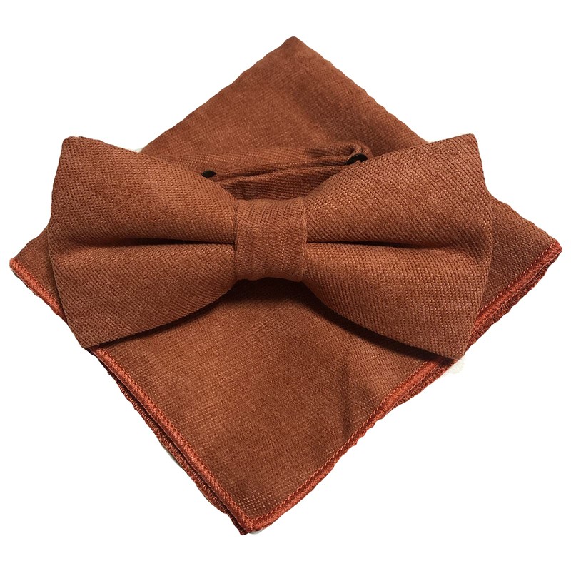 Brown Orange [Bow Tie & Pocket Square] 2-piece Set, Men's One-Touch Formal Plain Wedding After-Party, brown orange
