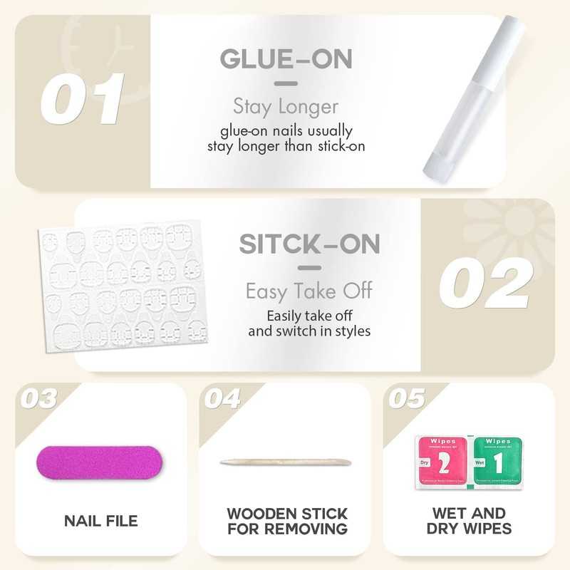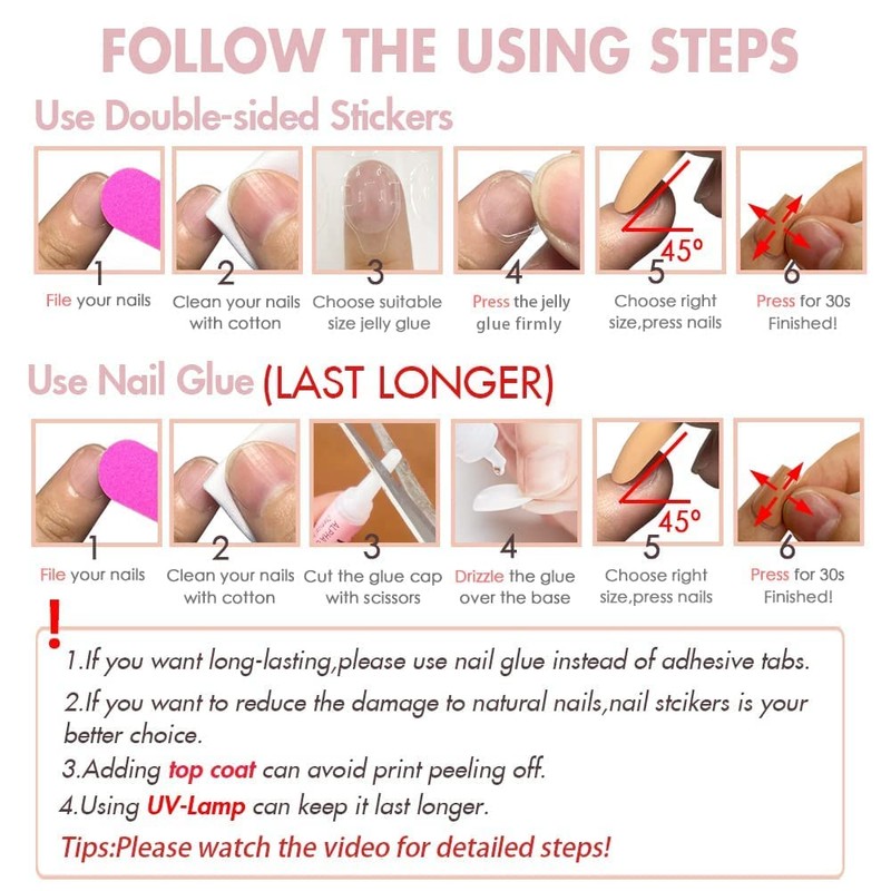 - 3 minutes, brand new nail studio look: the fake acrylic nails are ready to wear, without nail polish, UV lamp and drying time. You can easily get salon false fingernails and enjoy the fun of DIY in just a few minutes, spend a lot of time and money in the nail salon.