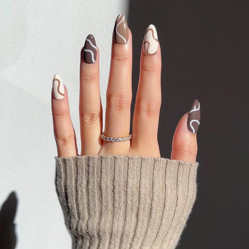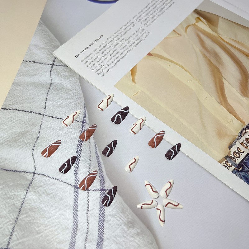 - Salon perfect press on nails: Inspired by custom salon acrylic, these medium nails for women are design with brown and white swirls, looks fresh and sweet. KXAMELIE is really good at combining the hottest trendy elements with classic colour and shape, your nails will always look classic, go well with your outfits and make-up.