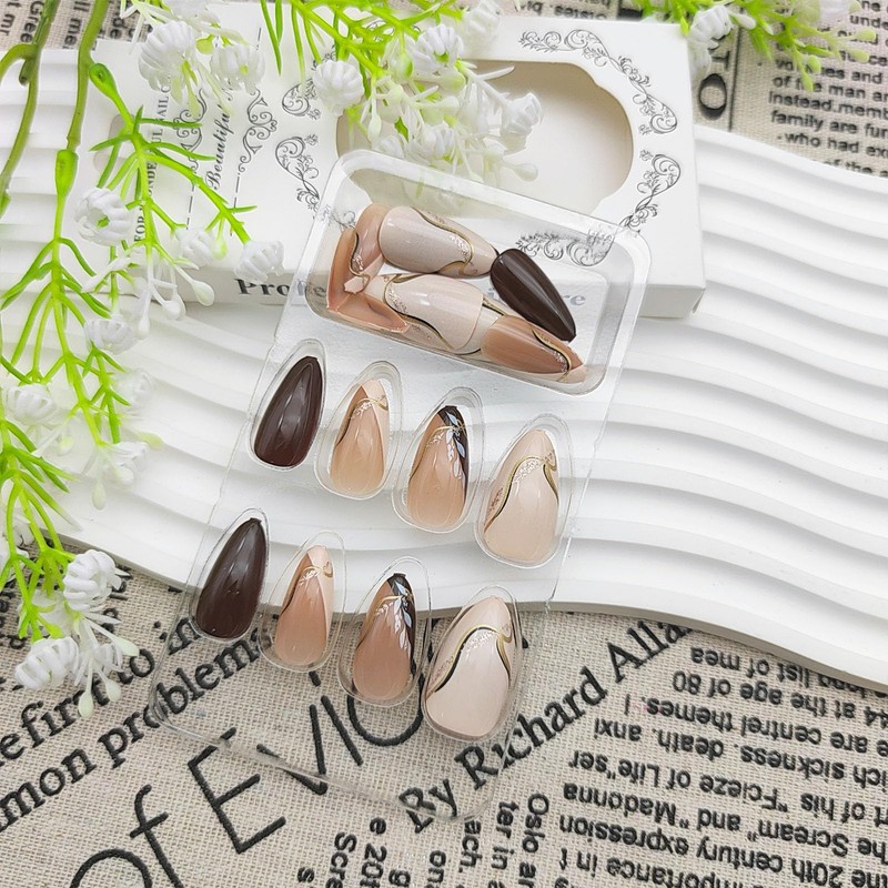 Brown Press on Nails Medium Almond Fake Nails with Leaves Designs Line Nails Press ons Off-White Acrylic Nails Glossy Glue on Nails Full Cover False Nails Fall Winter Stick on Nails for Women 24Pcs