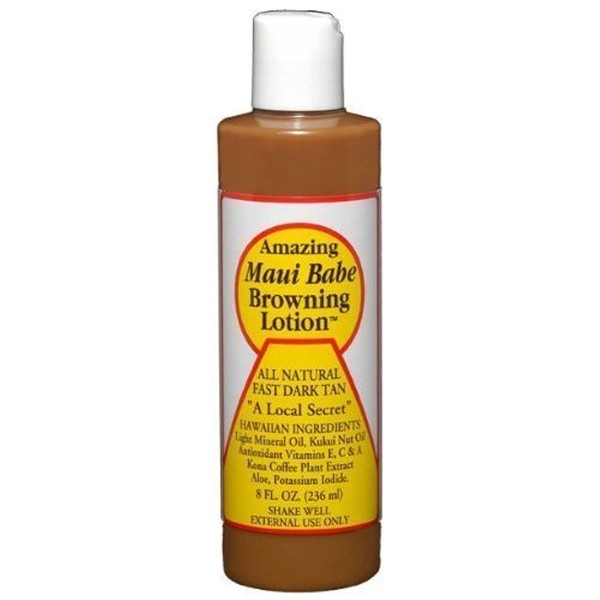 Old Family Formula of Natural Hawaiian Ingredients for a Fast, Dark, Accelerated Tan. Only Tanning Lotion that is Brown, and is called "Browning Lotion," Because Brown is what you want to be. Natural skin Protection and Moisturizing Benefits. Aloe Prevents Burning while Blended Ingredients Promote a Deep, Dark, Lasting Tan with just a short time in the sun. Made on Maui, Water resistant.