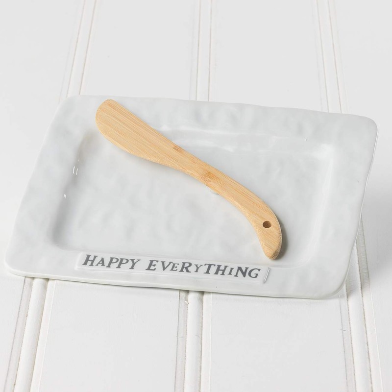 Brownlow Gifts Artisan Home Collection White Serveware, 9 x 6.5-Inches, Happy Everything Cheese Plate & Spreader
