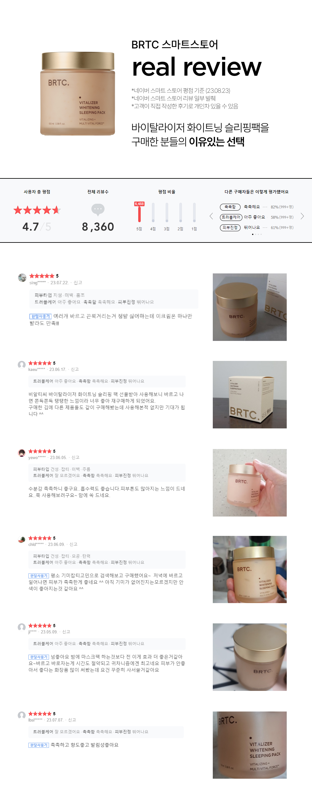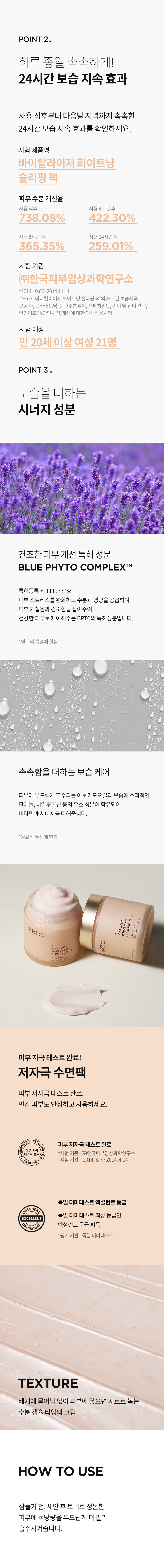 • 사용방법: 잠들기 전, 세안 후 토너로 정돈한 피부에 적당량을 부드럽게 펴 발라 흡수시켜줍니다.