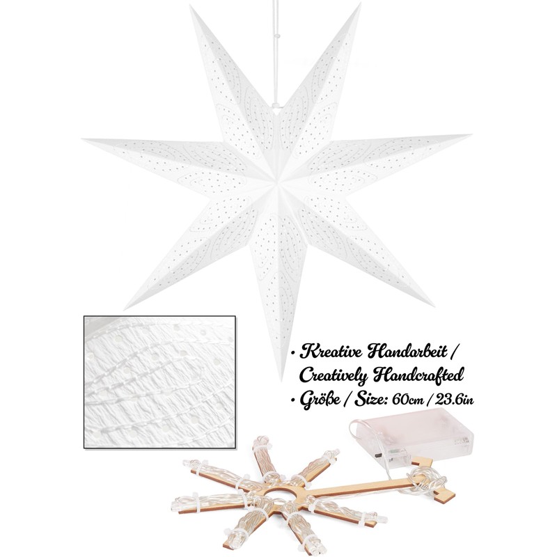 BRUBAKER 60 cm Paper Christmas Star for Hanging - LED Advent Star for Christmas Decoration and Windows - 3D Paper Star with Timer Function - Hanging Luminous Star - White