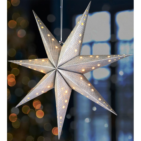 BRUBAKER Christmas Star for Hanging with E14 Socket - 60 cm Paper Star Set with 3.5 m Cable - 3D Advent Star - Window Decoration Luminous Star Hanging - Silver
