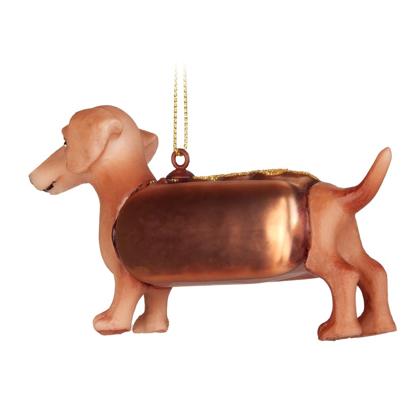 - The Dachshund as a hot dog has the following dimensions: 3.1 x 6.1 x 10.8 cm (W x H x L). Weight: 40g The front and rear of the Dachshund are made from polyresin (resin). Discover our unusual variety with over 100 fun Christmas baubles
