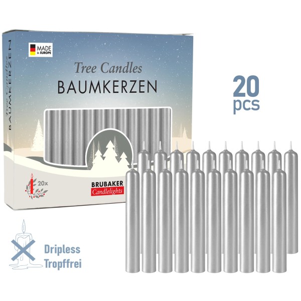 BRUBAKER Tree Candles - Pack of 20 - 9.5 cm - Silver