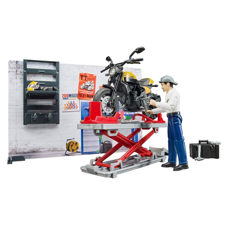 - Attach the bike to the lift and the repair work can begin. With this set, the fun is pre-programmed. Of course, you can also combine the bworld motorcycle workshop with the other bworld themed sets from Bruder