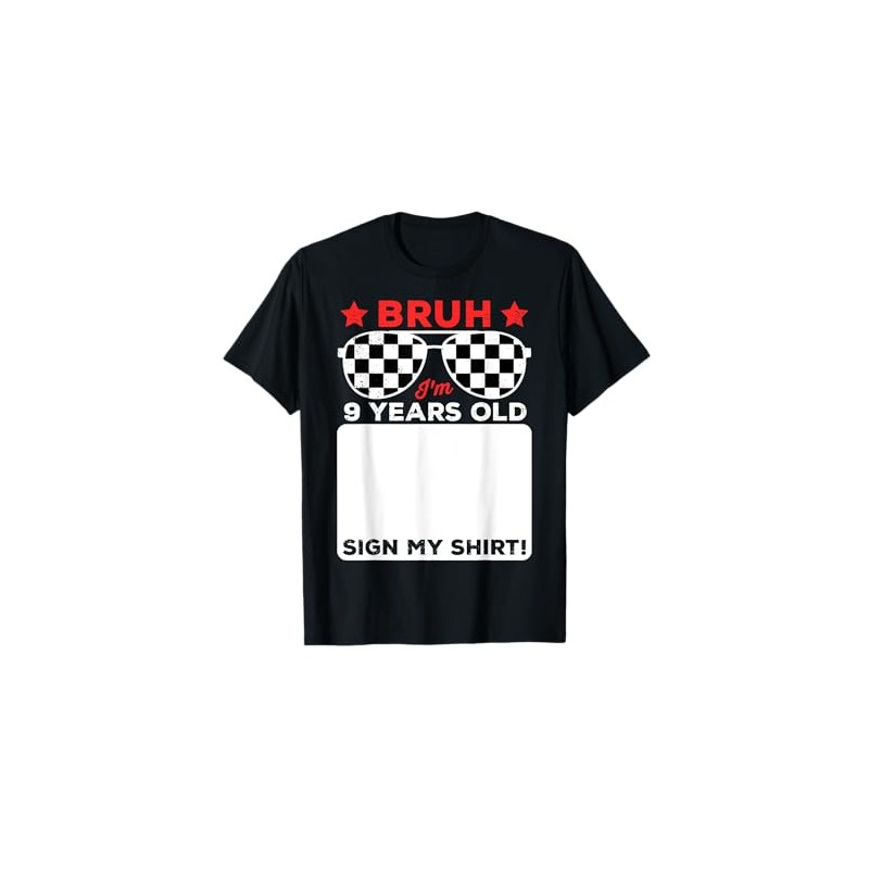 - Bruh I'm 9 Years Old Sign My Shirt Checkered 9th Birthday Race Car design for boys and girls turning 9. Funny racing birthday party tee for 9 year old boys and checkerboard lovers. Vintage novelty design for kids with retro sunglasses and a race car flag.