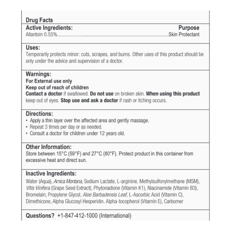 Este gel combina ingredientes naturales como árnica, vitamina K y bromelina para ofrecer un cuidado completo en casos de golpes y moretones. La fórmula ayuda a reducir la inflamación, aliviar el dolor y acelerar la reparación de los tejidos afectados, mejorando la apariencia de la piel y promoviendo una recuperación más rápida.