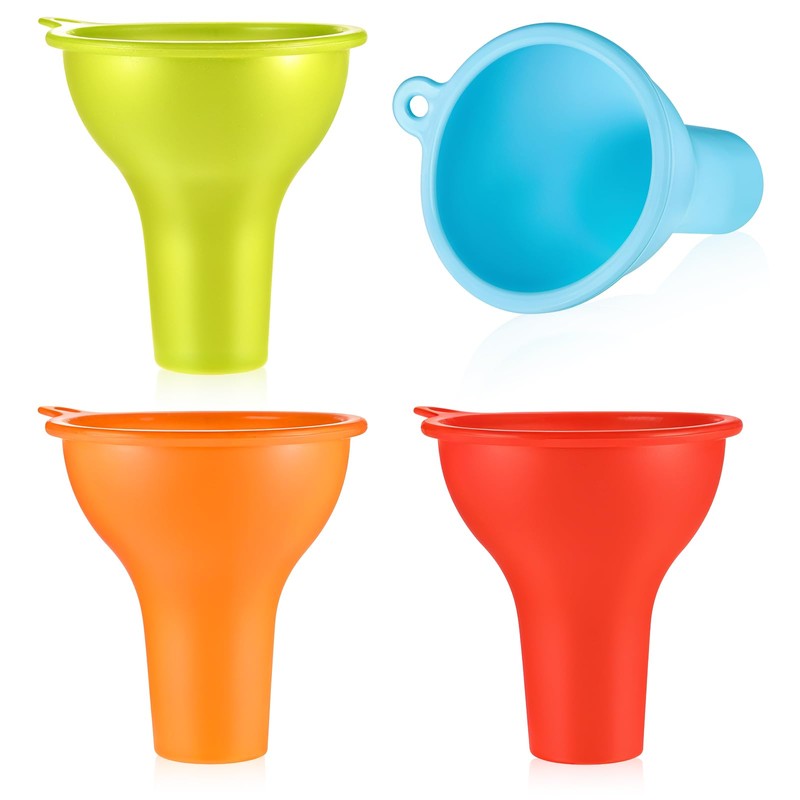 - What You Get: This set includes 4 pcs of brightly colored silicone funnels in red, blue, orange, and green, whether transferring liquids or solids, these funnels are designed to make your tasks easier and more efficient.
