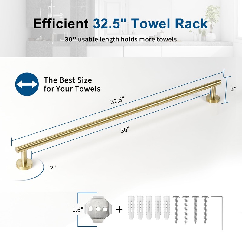 - 【30 Inch Towel Rack】 Towel bar for bathroom wall is ingeniously designed to maximize space utilization.Total length 32.5 inch towel racks, 30 inch usable rack, 3 inch wall spacing, proper wall spacing keeps towel drying quicker, small size does not take up much space and can easily hold multiple towels or robes, helping to keep your bathroom organized and tidy.
