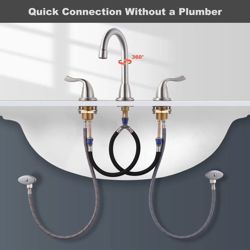 - 【Two Handles & 360° Swivel Spout】Two lever handle makes this vanity faucet easy to adjust the cold or hot water. High arc 360° Swivel spout provides more space for sink tasks, like brushing teeth and washing hands. Configure with 3/8" supply lines in 24in length and pop up drain.