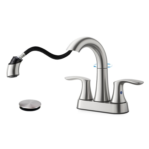 FROPO Bathroom Faucet with Pull Out Sprayer, 4 Inch 3 Hole Bathroom Sink Faucet, 360 Swivel Widespread Pull Down Bathroom Faucet with Pop Up Drain and Water Supply Line - Brushed Nickel