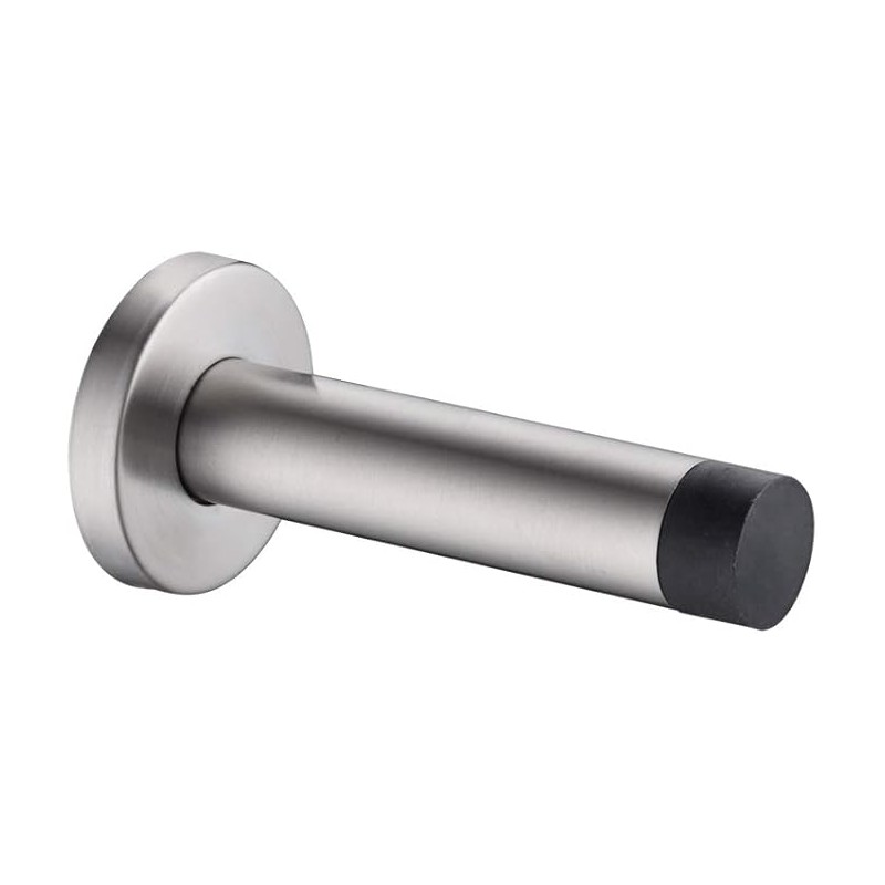 Brushed stainless steel door stopper with a black rubber tip, designed to reduce door impact and help protect walls with a clean, minimalist look.