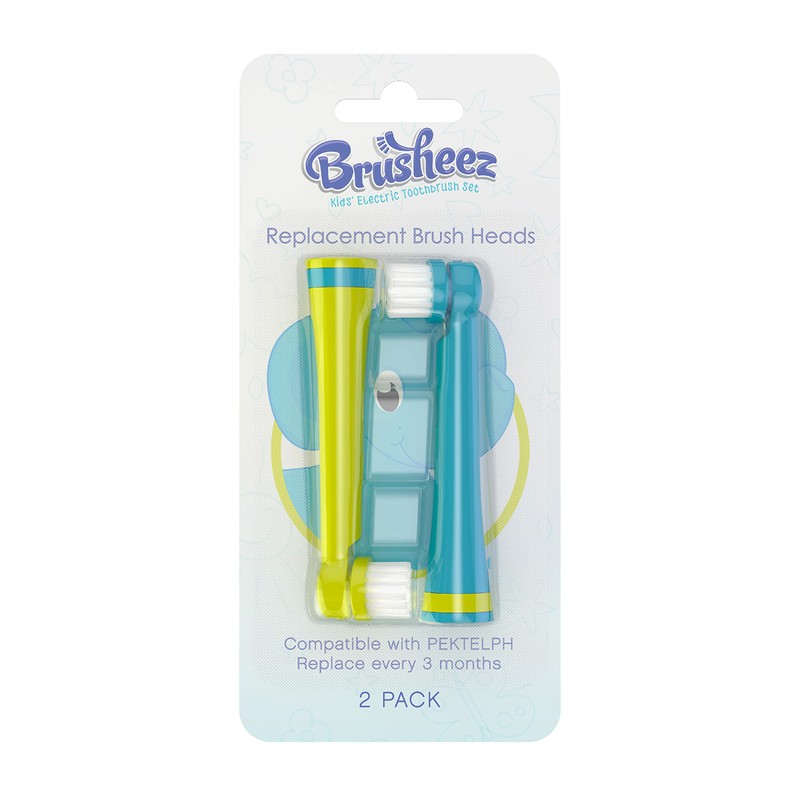 Keep your child's Brusheez electronic toothbrush working optimally with these replacement brush heads designed in colors that coordinate with your existing toothbrush set.Our replacements come in a convenient 2-pack and coordinate perfectly with your child’s Brusheez toothbrush. Product Details: Quick twist-and-click installation Compact design is perfect for reaching hard-to-clean areas of the mouth Quality tested and CPSIA approved for safe, effective cleaning Durable bristles last up to 3 months before each individual brush head needs to be replaced Compatible with Brusheez Electronic Toothbrush Set for Ollie the Elephant Dentists recommend that you install a new brush head at least every 3 months or sooner if any of the following situations occur: Your child has been sick Your brush head is tattered and worn Your child has used the toothbrush to clean something other than his or her teeth