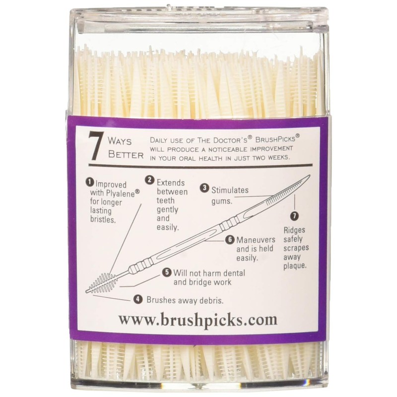 - Interdental Toothpicks Longer head with more bristles. Safely removes food debris. Stimulates gums to promote periodontal health. Fights gingivitis. Daily use of The Doctor's BrushPicks will produce a noticeable improvement in your oral health is just two weeks. 1. Improved with Plyalene for longer lasting bristles. 2. Extends between teeth gently and easily. 3. Brushes away debris. 4. Stimulates gums. 5. Will not harm dental and bridge work. 6. Maneuvers and is held easily. 7. Safely scrapes away plaque. Total of 250 toothpicks.