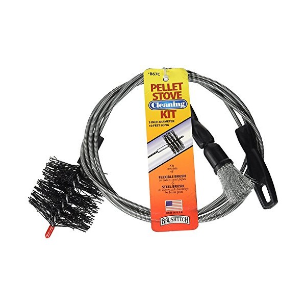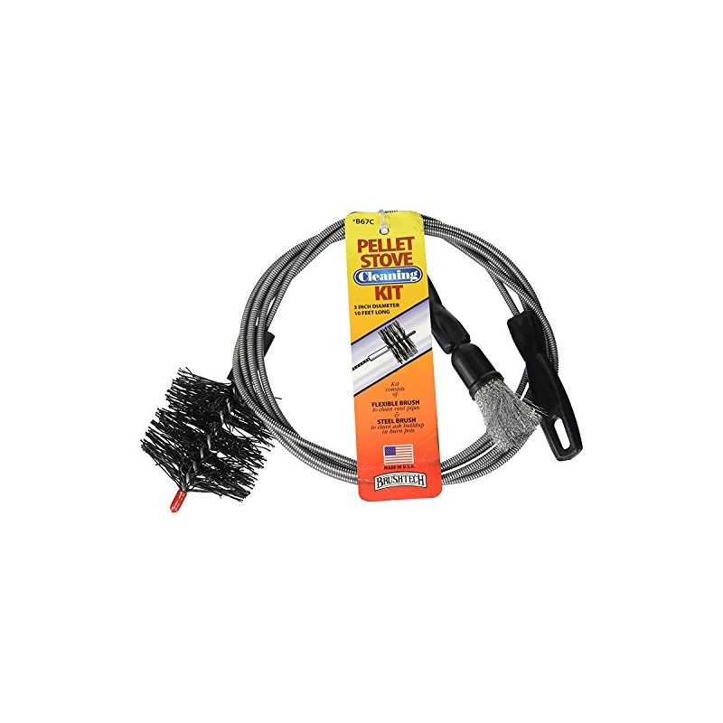 Brushtech Pellet Stove Cleaning Brush Kit - 10-Foot Non-Kinking Spring Brush for 3-Inch Vent Pipes with Bonus Steel Ash Brush - Safe Airflow Maintenance for Stove Pipes