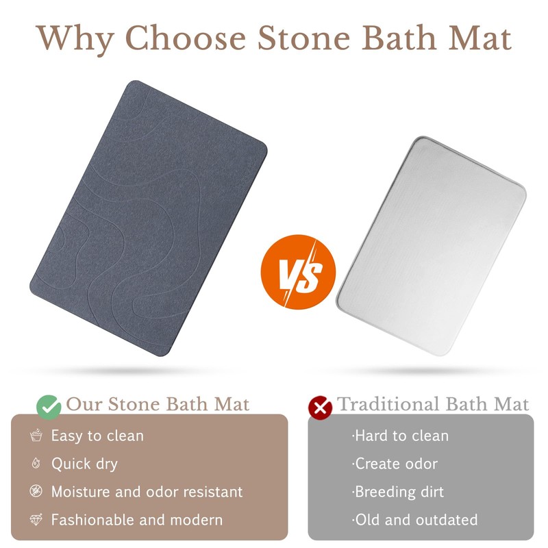 - 【Quick Drying and Super Absorbent】Made from natural diatomaceous earth with a porous structure of itself makes the stone mat super absorbent, can instantly absorb water and dry within minutes. This stone bath mat keep floors clean, dry at all times, making your feet feeling dry and comfort when you stand on after bathing or showering
